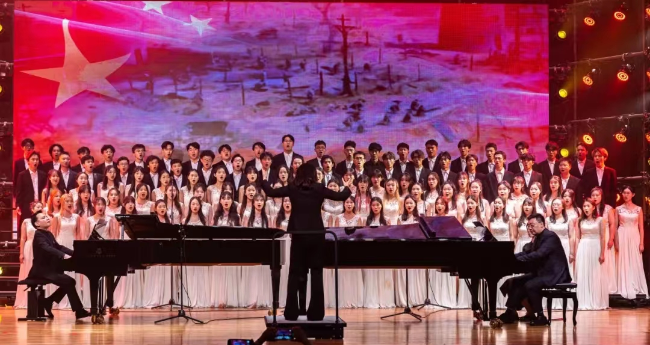 由何應(yīng)聰老師執(zhí)棒、音樂教育學(xué)院副院長(zhǎng)盧格霖和余捷老師擔(dān)任雙鋼琴演奏壓軸曲目《黃河頌》和雙鋼琴與合唱《保衛(wèi)黃河》,再現(xiàn)了抗日戰(zhàn)爭(zhēng)時(shí)期中華兒女眾志成城、英勇戰(zhàn)斗的壯麗場(chǎng)景,表達(dá)了奪取勝利的激情與必勝的樂觀主義情懷。讓觀眾在音樂的魅力中尋找民族復(fù)興的力量源泉,感受藝術(shù)與信仰的魅力。