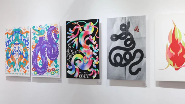 本次展覽以不同的設計形式與多樣的呈現(xiàn)方式,打造了生動有趣的藝術(shù)氛圍,革新了人們對“龍”的傳統(tǒng)定位與感知。多樣的“龍”元素以立體的方式懸掛于空間中心,成為龍年最佳打卡裝置。貼片龍的墻面造型成為展覽中特別的指路標志,同時,生肖主題掛畫也為公眾生動呈現(xiàn)了龍圖騰的靈動英姿。