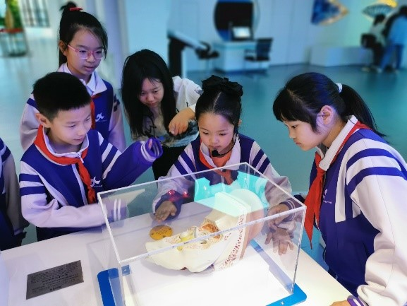 隨后,學(xué)生們一同到全國科普基地——生命科學(xué)館進(jìn)行實(shí)地研學(xué)。學(xué)生們在現(xiàn)場了解了人體的呼吸系統(tǒng)、消化系統(tǒng)、循環(huán)系統(tǒng)、組織學(xué)與胚胎學(xué)等生命科學(xué)知識。生命科學(xué)館提供了豐富的互動體驗(yàn)項(xiàng)目,如運(yùn)動中的骨骼、腕力測試等,大大提高了學(xué)習(xí)的趣味性,讓學(xué)生們能夠更加深入地了解生命科學(xué)的奧秘。