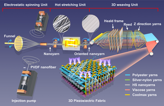 該工作首先通過共軛靜電紡絲和熱牽伸工藝,制備出強度高達313.3 MPa的PVDF壓電納米纖維紗線(滿足3D織造的要求),隨后采用3D紡織技術(shù),將PVDF壓電紗線、導(dǎo)電紗線和不同吸濕性能的絕緣紗線按照下圖所示的結(jié)構(gòu)進行分布,織造成3D壓電織物(3DPF)傳感器。在已報道的柔性壓電傳感器中,3DPF的抗拉強度最高,達到46.0 MPa。