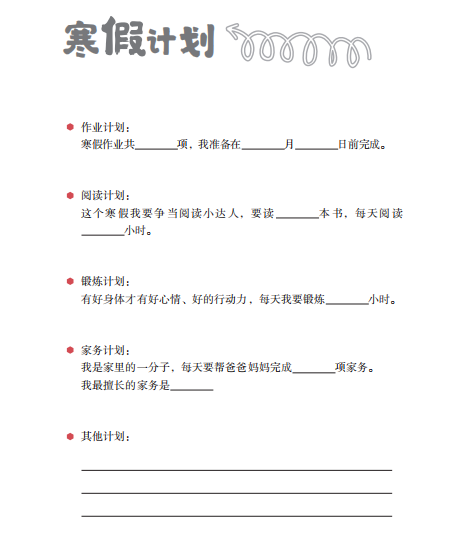 寒假計劃表:寒假讓孩子自己定一個小目標(biāo),作業(yè)、閱讀、家務(wù)、鍛煉……樹立目標(biāo),才能在假期結(jié)束的時候檢驗成果,讓假期時光可追溯。