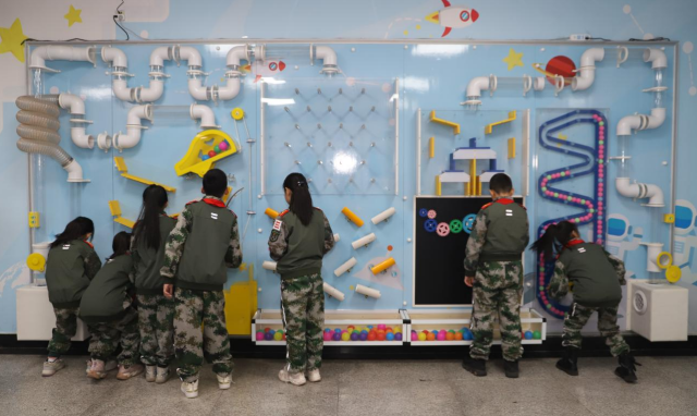 學(xué)生利用課間在科學(xué)實景互動體驗墻進行操作體驗