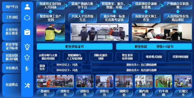 搭建實體型、虛仿型產教融合教學平臺。打造產教融合實訓基地和仿真實訓基地,構建“智慧教室、服務、數據、環(huán)境”四大平臺,依托市級示范性虛擬仿真實訓基地,改造50個VR/AR工位,實現“高端化、智能化、綠色化”貫通。建成重慶市唯一標準化競賽考證場、優(yōu)質課程資源研發(fā)基地、首席技能大師工作室及裝備制造技能教師培訓基地。