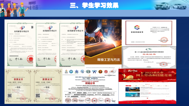 產教協同成果豐碩:累計發(fā)表相關論文15篇,出版專著2部,主持教育部重點課題1項(已結題)。校企聯合開發(fā)實訓小程序24個,取得發(fā)明專利14項建成市級示范性虛擬仿真實訓基地,制定人才培養(yǎng)標準在全市推廣。教師出版專著2部,發(fā)表論文15篇,出版教材10本,建成市級職業(yè)教育專業(yè)教學資源庫2個、市級在線精品課程5門、市級示范性虛擬仿真實訓基地1個、市級微課比賽獲獎59人次(全市排名第二)。中高貫通培養(yǎng)2560人,開發(fā)中高職銜接課程16門,建成資源庫1個,新增國規(guī)教材3本、國家在線精品課程1門,全國教學設計案例交流展示7個(數量全市第一)。編寫《焊接技術應用專業(yè)人才培養(yǎng)指導方案》《焊接技術應用專業(yè)核心課程標準》在全市推廣并公開出版。方向課程《焊接工藝與方法》是重慶市中職學校課程思政示范建設課程,重慶市中等職業(yè)精品在線開放重點課程。