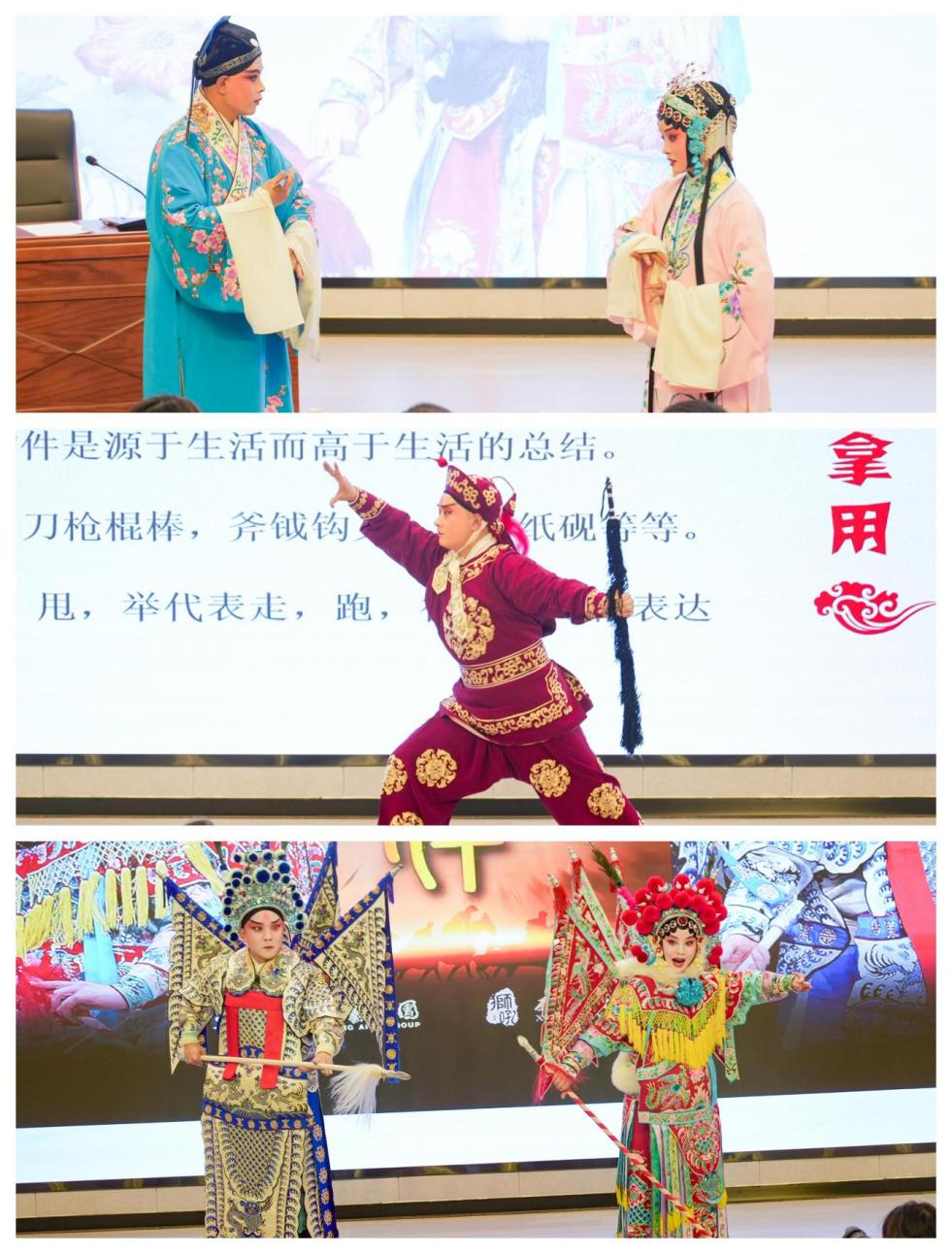 活動期間,舞臺上生動的互動體驗,讓大家更直觀地領(lǐng)略到傳統(tǒng)文化的深厚底蘊和戲服下流淌的千年文脈。舞臺上,多名演員以“生、旦、凈、丑”四大行當為脈絡(luò),現(xiàn)場演繹并傳授“撲蝶”“喂雞”“穿針引線”等經(jīng)典戲曲動作,并邀請學生模仿,演員老師細致拆解動作要領(lǐng)與內(nèi)涵,深入淺出地闡釋戲曲藝術(shù)中“以虛寫實、以形傳神”的美學精髓。學生們?nèi)褙炞?、踴躍參與,在互動環(huán)節(jié)中爭相效仿。