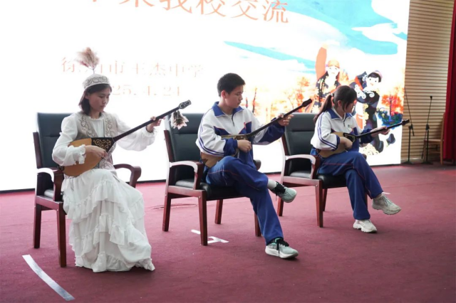 奎屯三中學(xué)生表演了冬不拉演奏和民族舞蹈《黑走馬》,王杰中學(xué)初三學(xué)生則帶來(lái)歌舞表演《壁上觀》,兩地學(xué)生精彩的才藝展示呈現(xiàn)出鮮明的地域文化特質(zhì),將交流活動(dòng)推向高潮。