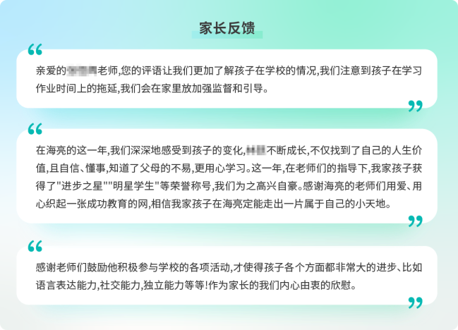 家長(zhǎng)作為孩子成長(zhǎng)道路上不可或缺的伙伴與引路人,在這份成長(zhǎng)的報(bào)告單里當(dāng)然也不能缺席。“星未來(lái)期末報(bào)告單”單獨(dú)為家長(zhǎng)開(kāi)辟了一個(gè)反饋板塊,讓家長(zhǎng)的聲音被聽(tīng)見(jiàn),與學(xué)校共同關(guān)注孩子的每一步成長(zhǎng)。