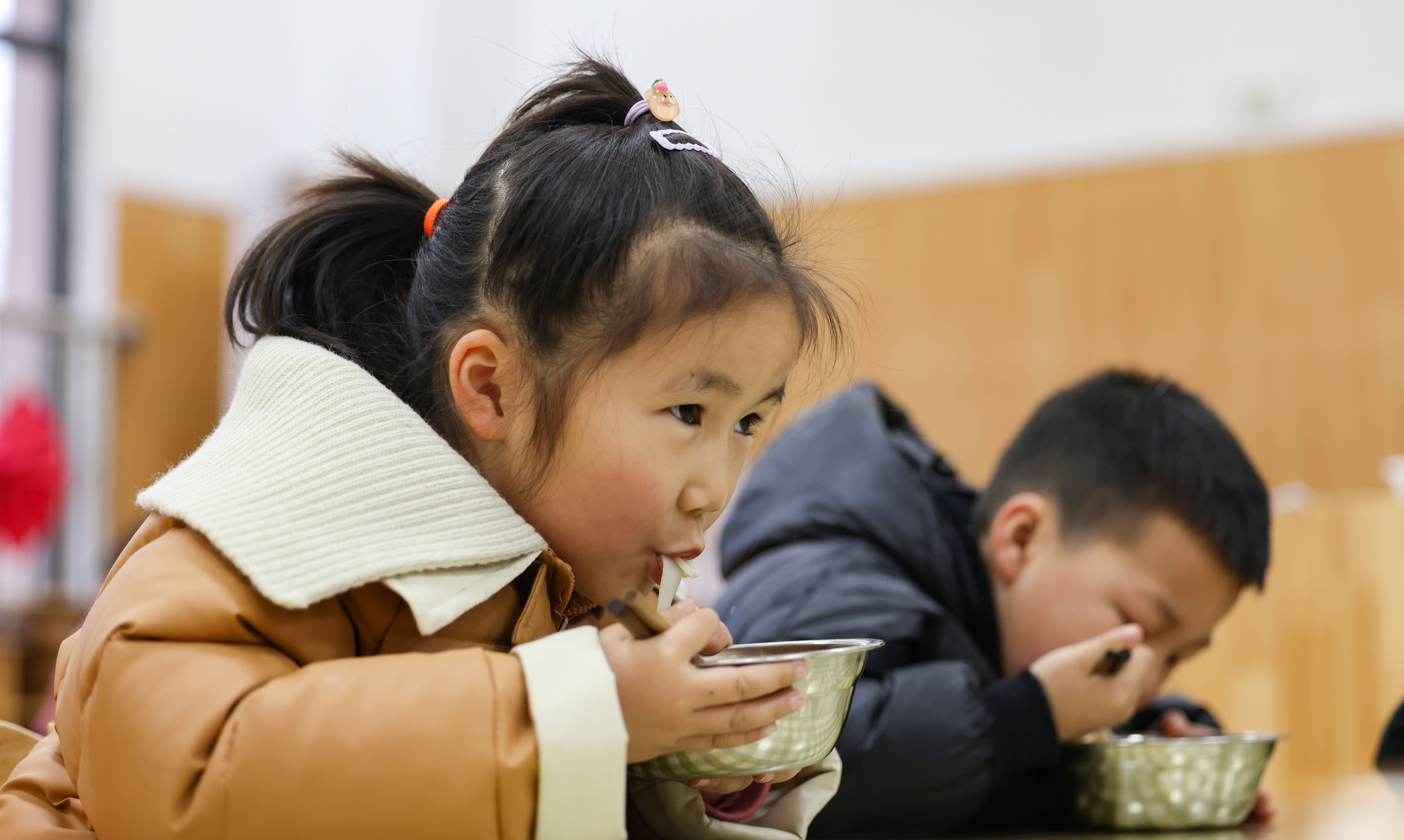 2月21日,貴州省銅仁市玉屏侗族自治縣第四幼兒園的小朋友在享用營(yíng)養(yǎng)早餐。胡攀學(xué) 攝
