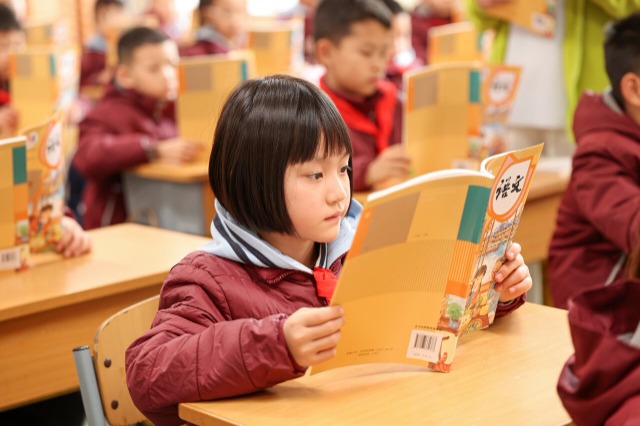學(xué)生認真閱讀新課本 侯崇慧 唐薇 攝
