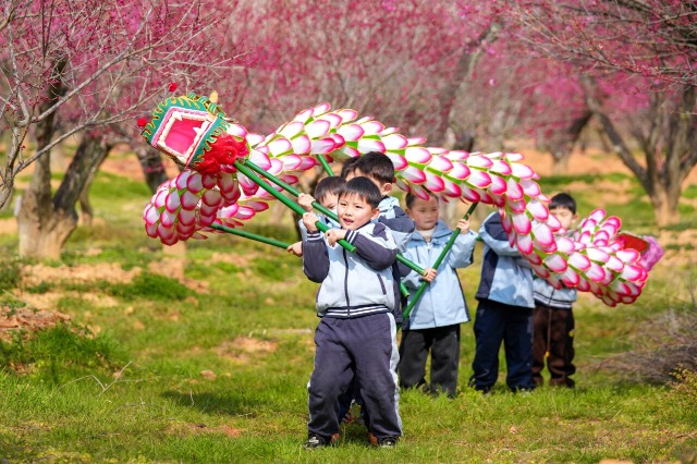 近日,浙江省湖州市長興縣林城鎮(zhèn)東方梅園內梅花盛開,林城鎮(zhèn)中心幼兒園把傳統(tǒng)舞龍課堂搬出教室,讓孩子們在花海中練習表演舞龍,傳承非遺文化,感受春日氣息。(中國教育報-中國教育新聞網 通訊員 陳海偉 攝)