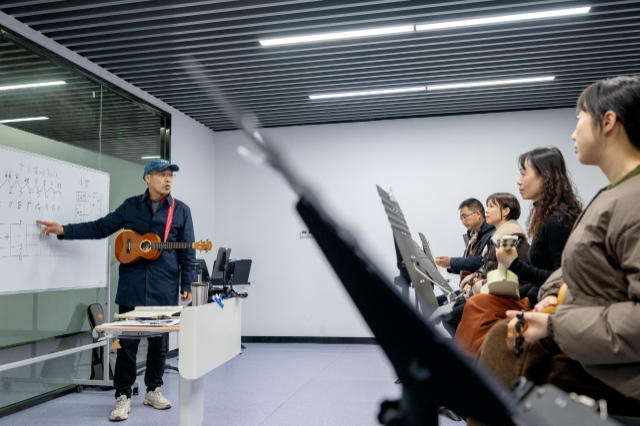 企業(yè)職工在公益講師的指導(dǎo)下學(xué)習(xí)演奏尤克里里 譚云俸 攝