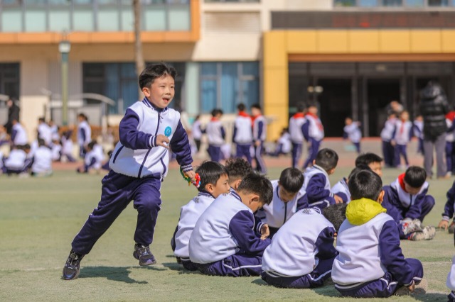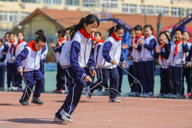 2月26日,山東省青島市李滄區(qū)實(shí)驗(yàn)小學(xué),學(xué)生在15分鐘課間進(jìn)行滾鐵環(huán)、打陀螺、丟手絹等傳統(tǒng)體育活動(dòng),讓傳統(tǒng)游戲在校園中煥發(fā)出新活力。近年來,青島市李滄區(qū)在全區(qū)小學(xué)校園常態(tài)化將課間10分鐘延長(zhǎng)至15分鐘。各學(xué)校根據(jù)實(shí)際情況創(chuàng)設(shè)踢毽子、跳繩、呼啦圈等豐富多元的課間活動(dòng)。延長(zhǎng)課間時(shí)間后,學(xué)生有更多機(jī)會(huì)進(jìn)行體育鍛煉和戶外活動(dòng),不僅提升了學(xué)生體質(zhì),更有助于緩解學(xué)生學(xué)習(xí)壓力、改善心理健康,促進(jìn)學(xué)生健康成長(zhǎng)。(中國(guó)教育報(bào)-中國(guó)教育新聞網(wǎng) 通訊員 張鷹 攝)