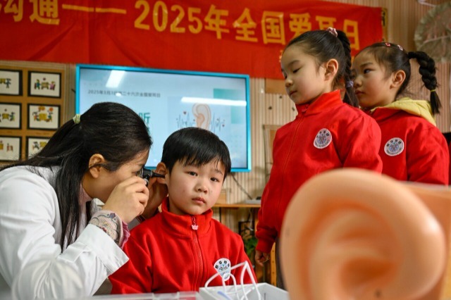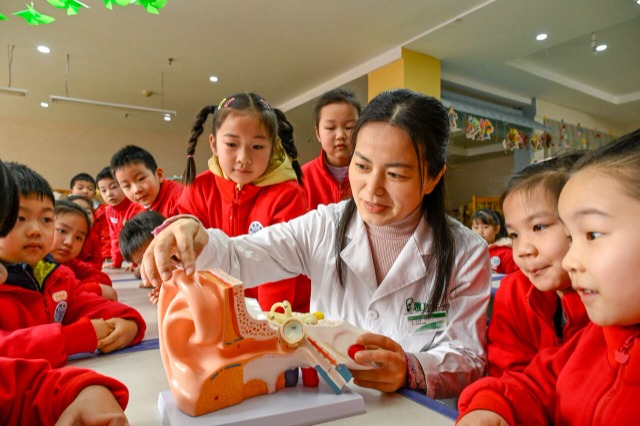 為迎接3月3日第26個全國愛耳日的到來,安徽省合肥市廬陽區(qū)亳州路街道關(guān)工委聯(lián)合轄區(qū)衛(wèi)生服務機構(gòu)走進轄區(qū)各小學幼兒園為孩子們檢查耳朵及聽力,并通過模型向孩子們講解耳朵的構(gòu)造功能,引導孩子們養(yǎng)成健康的用耳好習慣。(中國教育報-中國教育新聞網(wǎng) 通訊員 趙明 攝)