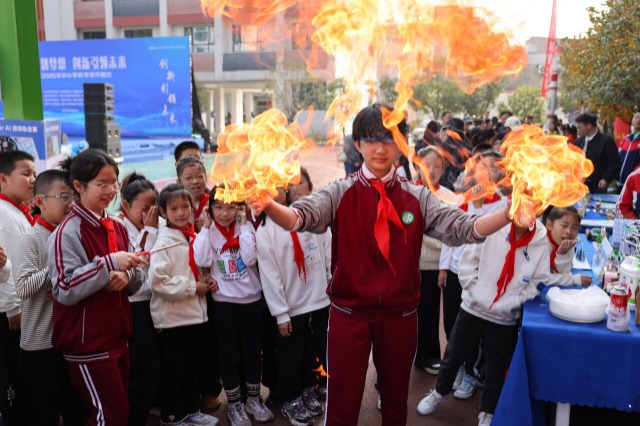 學生們正在進行“火焰拳”的科學實驗展示。通訊員 付曉方 攝