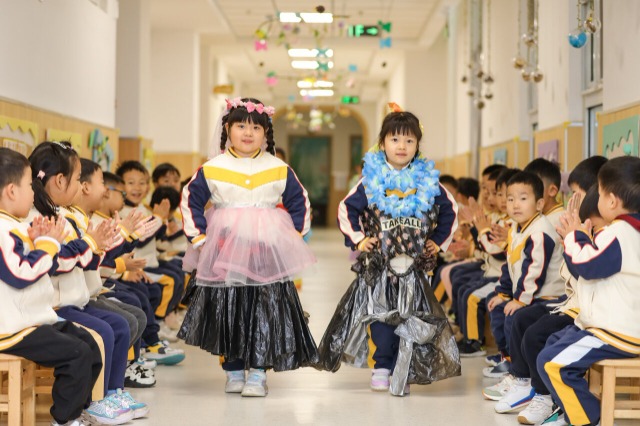小朋友用廢棄物品制作“環(huán)保時裝”。通訊員 張鷹 攝