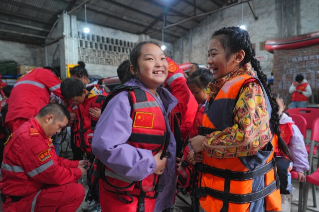孩子們?cè)趯W(xué)習(xí)救生衣穿戴方法 秦廷富 攝