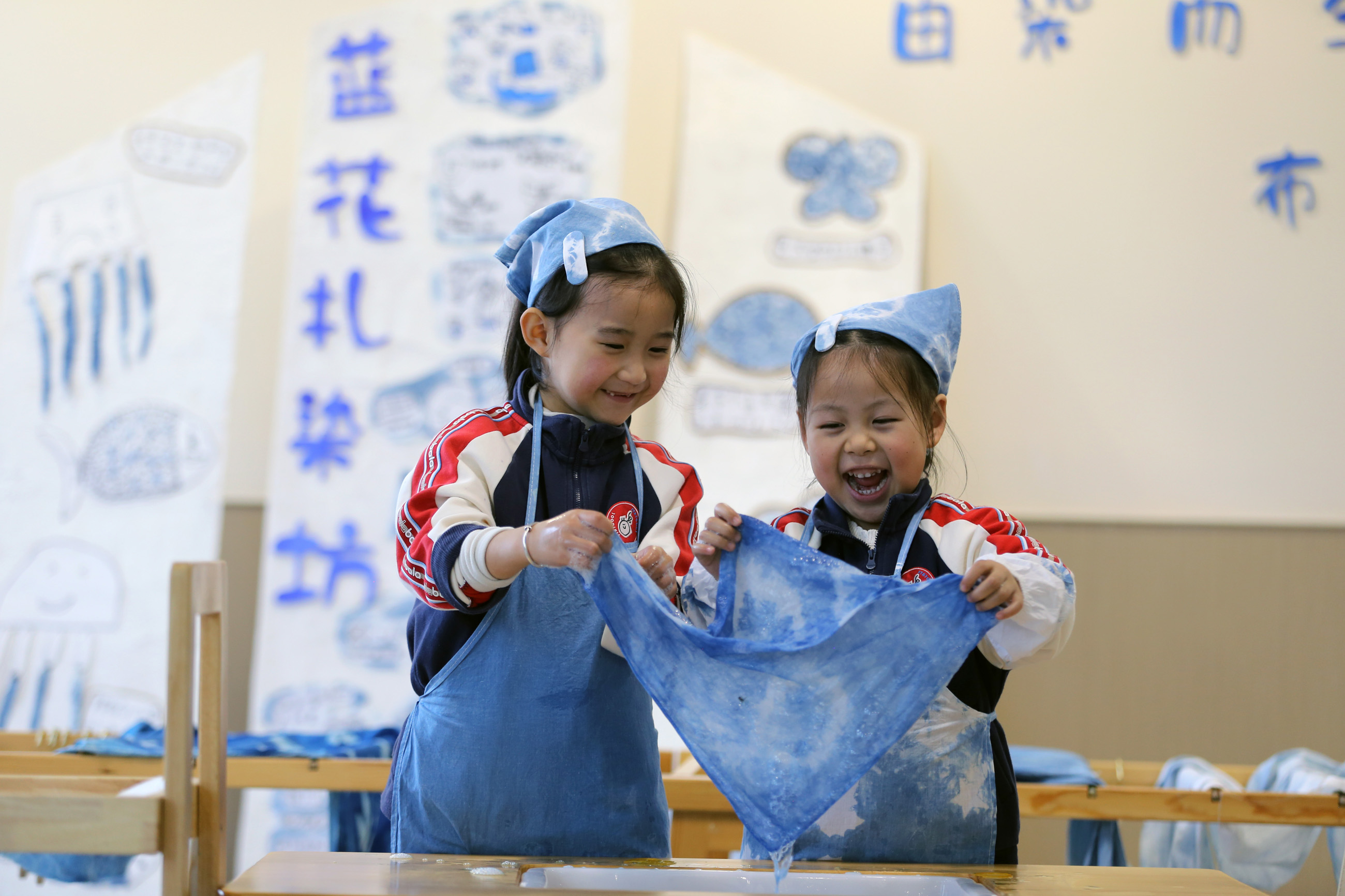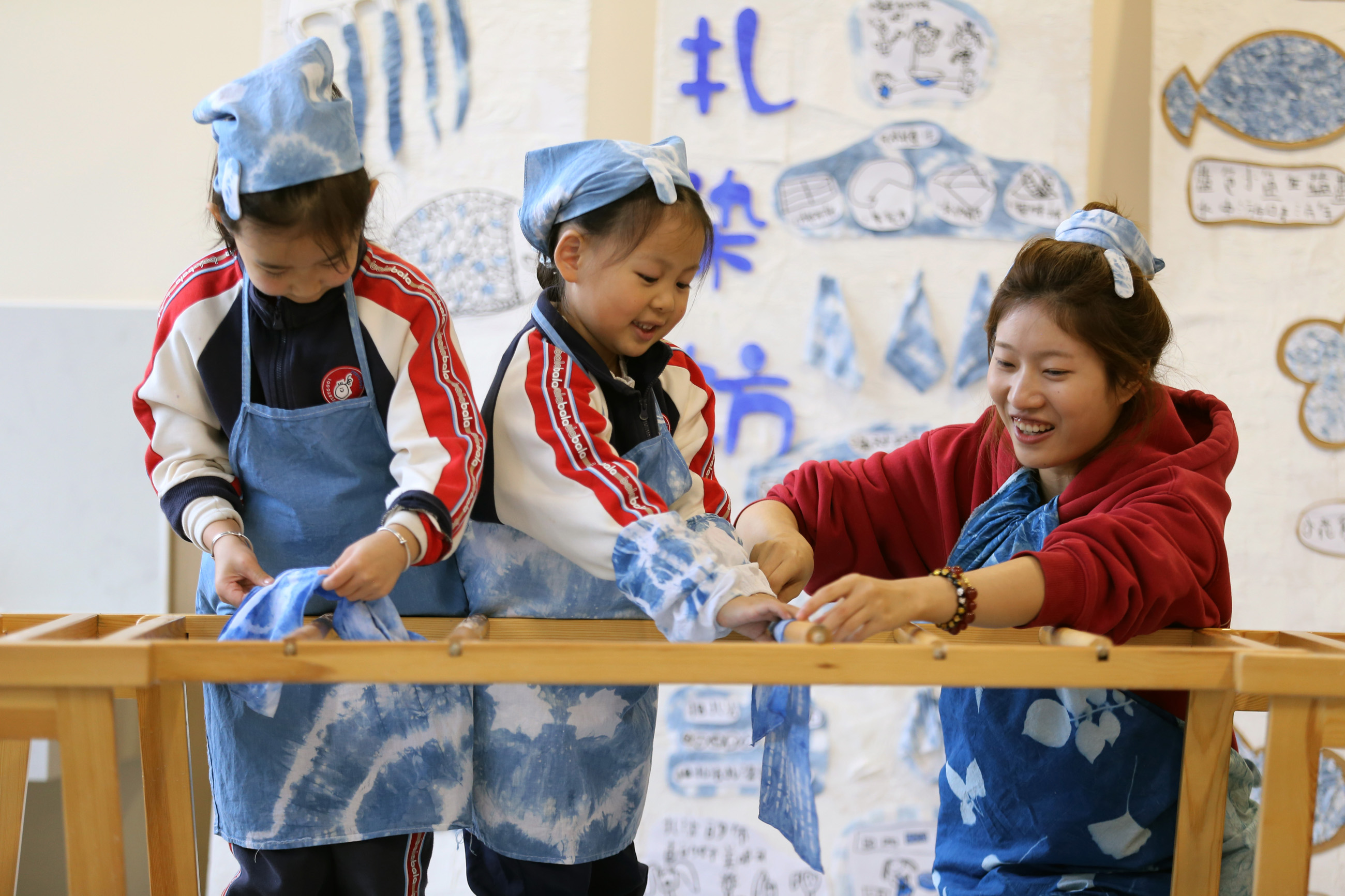 11月19日,四川省樂山市實(shí)驗(yàn)幼兒園至樂分園,老師指導(dǎo)孩子們晾曬自己的扎染作品。李華時(shí) 馬露 攝