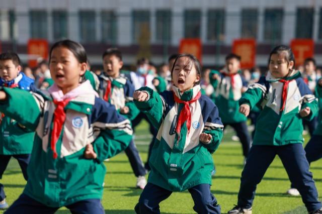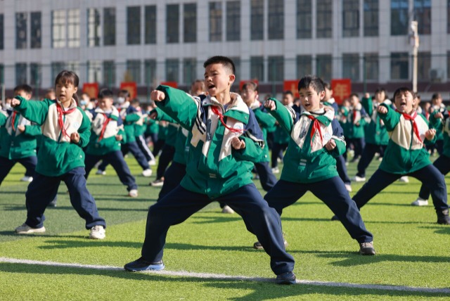 11月25日,貴州省銅仁市玉屏侗族自治縣第二小學(xué)的學(xué)生在大課間練習(xí)傳統(tǒng)武術(shù)。近年來,貴州省銅仁市玉屏侗族自治縣第二小學(xué)十分重視學(xué)生身體素質(zhì)提升,結(jié)合學(xué)生愛好和特色辦學(xué)需要,將傳統(tǒng)武術(shù)納入大課間活動,弘揚傳統(tǒng)武術(shù)文化,助力學(xué)生健康快樂成長。中國教育報-中國教育新聞網(wǎng)通訊員 胡攀學(xué) 攝