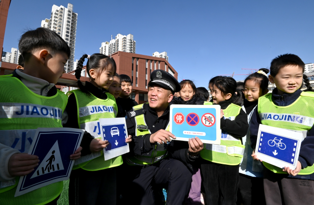 民警指導(dǎo)學(xué)生們識(shí)別交通標(biāo)志。通訊員 郝群英 攝
