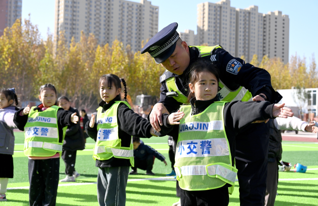 民警指導(dǎo)學(xué)生學(xué)習(xí)交通指揮手勢(shì)。通訊員 郝群英 攝
