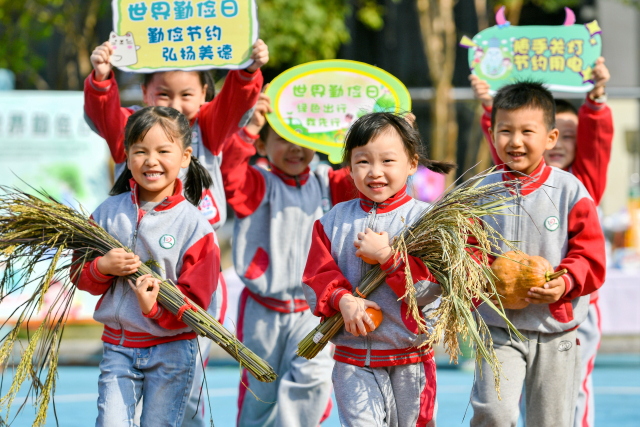 10月29日,浙江省長興縣泗安鎮(zhèn)中心幼兒園的孩子們正在參加快樂運糧食活動。當日,長興縣泗安鎮(zhèn)中心幼兒園開展勤儉節(jié)約主題活動,青年文明號團員教師與孩子們一起參加手繪勤儉標識、快樂運糧食、玩轉(zhuǎn)科創(chuàng)作品等活動,學習尊重勞動、愛糧惜糧的傳統(tǒng)美德,感悟農(nóng)耕文化,將勤儉節(jié)約理念扎根童心。譚云俸 攝