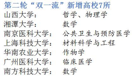 中國教育報-中國教育新聞網(wǎng)北京2月14日訊(記者 唐琪)記者今天從教育部獲悉,第二輪“雙一流”建設(shè)高校及建設(shè)學科名單公布,共有建設(shè)高校147所。其中,山西大學、湘潭大學、南京醫(yī)科大學、上海科技大學、華南農(nóng)業(yè)大學、廣州醫(yī)科大學、南方科技大學等7所高校的8個專業(yè)新增入選第二輪“雙一流”建設(shè)高校及建設(shè)學科名單。