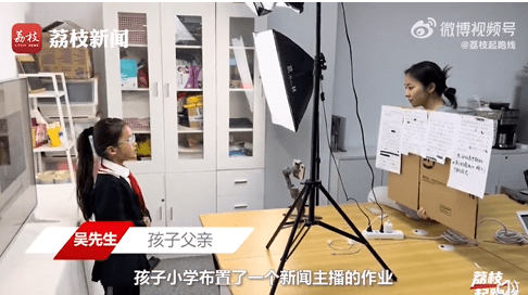在江蘇南京,一小學(xué)布置了一項(xiàng)新聞主播作業(yè),一名父親為了幫女兒完成作業(yè),就在公司臨時(shí)搭建了一個(gè)迷你版“演播廳”。孩子父親吳先生表示,覺得這個(gè)作業(yè)挺鍛煉孩子的語(yǔ)言表達(dá)能力,為了效果好一點(diǎn),就花了1個(gè)多小時(shí)搭了這個(gè)“演播廳”,希望以身作則,教育女兒學(xué)會(huì)認(rèn)真對(duì)待每一件事。