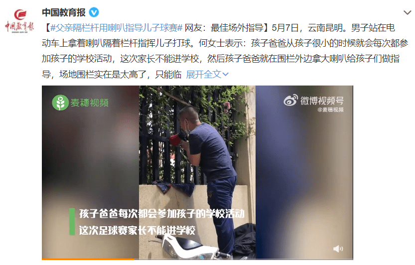 在云南昆明,一名父親站在電動(dòng)車上拿著喇叭隔著欄桿指揮兒子打球。據(jù)悉,這位爸爸從孩子很小的時(shí)候就會(huì)每次都參加孩子的學(xué)?;顒?dòng),因?yàn)檫@次家長(zhǎng)不能進(jìn)學(xué)校,所以孩子爸爸就在圍欄外邊拿大喇叭給孩子們做指導(dǎo),場(chǎng)地圍欄實(shí)在是太高了,只能臨時(shí)站在電動(dòng)車上,遠(yuǎn)程給孩子們指導(dǎo)。