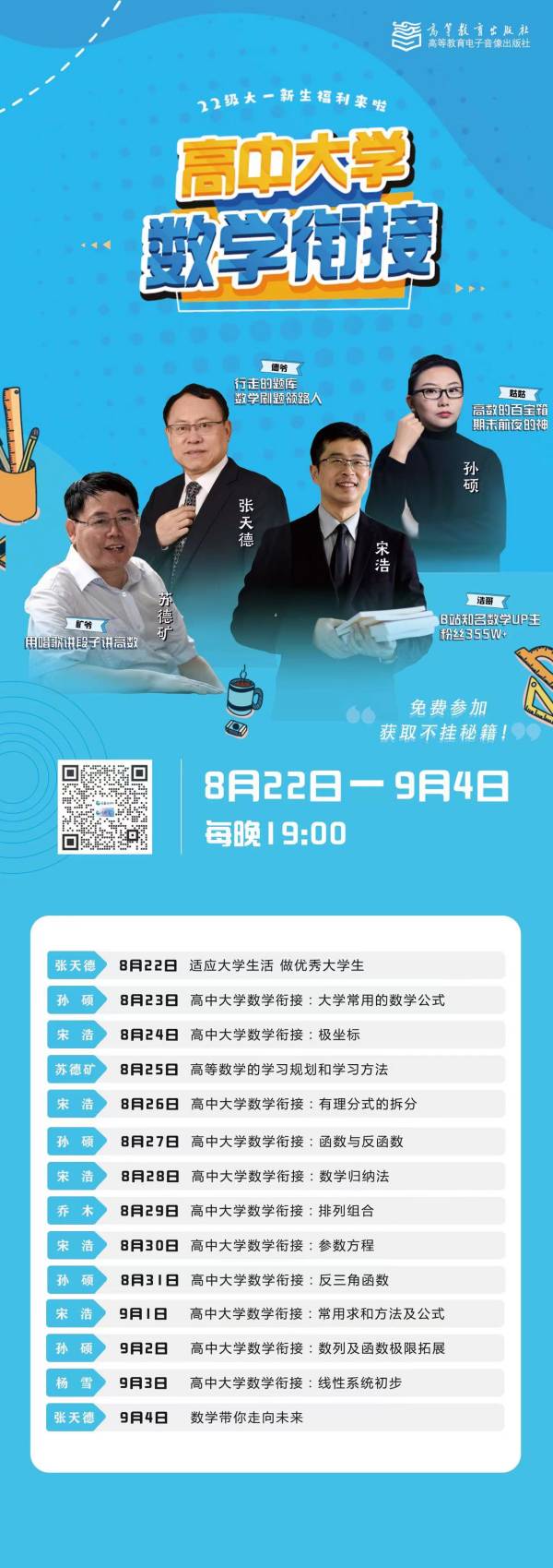“高中大學數(shù)學銜接課”共14期,8月22日至9月4日每晚7點至8點準時播出。高等教育出版社邀請了深受同學們喜愛的四位大咖教師擔任主講:曾獲全國十大最美教師、被同學們親切地稱為“礦爺”,能把數(shù)學課程變得妙趣橫生的浙江大學蘇德礦老師;山東教學名師、“行走的題庫”、數(shù)學競賽專家山東大學張?zhí)斓吕蠋?;全網(wǎng)粉絲390萬,高等數(shù)學視頻播放量1.5億次的山東財經(jīng)大學宋浩老師;以及被同學們親切地稱為姑姑、“高數(shù)叔”創(chuàng)始人,帶領無數(shù)學生通過期末考試的天津工業(yè)大學孫碩老師。