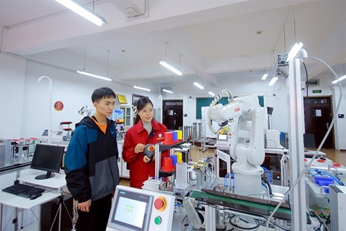 于是,李粉霞率先尋求校企合作之路,與蘇州勤美達(dá)精密機(jī)械有限公司連續(xù)九年開展“工學(xué)交替,頂崗實(shí)習(xí)”人才培養(yǎng)模式,實(shí)現(xiàn)了“校企雙主體”“過程四共同”(即共同制訂人才培養(yǎng)方案、共同組織實(shí)施培養(yǎng)過程、共同進(jìn)行質(zhì)量監(jiān)控、共同安排就業(yè)) “效果五共贏”(學(xué)校、企業(yè)、教師、學(xué)生、家長);率先開展“理實(shí)一體化”教學(xué)模式改革,提煉并歸納大賽賽項(xiàng)、企業(yè)生產(chǎn)項(xiàng)目,開發(fā)賽訓(xùn)融合課程;推行“三融合”項(xiàng)目化課程教學(xué)改革,建設(shè)實(shí)境化、企業(yè)化、生產(chǎn)化的校內(nèi)實(shí)訓(xùn)工廠,推行現(xiàn)場教學(xué)與虛擬仿真相結(jié)合、課堂教學(xué)與課外活動(dòng)相結(jié)合,知識(shí)教學(xué)與能力培育相結(jié)合的“三結(jié)合”教學(xué)模式;率先開展“社團(tuán)傳、導(dǎo)師幫、師傅帶、大賽練”的傳、幫、帶、練四級(jí)培優(yōu)工程,更好地實(shí)現(xiàn)了“技能為本,立德樹人”的價(jià)值目標(biāo);率先為本科院校、贊比亞等海外學(xué)員開展師資培訓(xùn),承擔(dān)國培項(xiàng)目;率先成立數(shù)控技能大師工作室,淮海集團(tuán)副總工程師“老匠人”李勇懷、中國運(yùn)載火箭研究院首席技能專家韓利萍等11位技術(shù)精英成為駐校大師,共同培養(yǎng)創(chuàng)新拔尖人才,共同開展技術(shù)攻關(guān)、實(shí)施技術(shù)改造;率先在全省開展工業(yè)機(jī)器人技術(shù)專業(yè),申報(bào)獲批教育部工業(yè)機(jī)器人技術(shù)應(yīng)用人才培養(yǎng)中心,并掛牌成為ABB工業(yè)機(jī)器人技能認(rèn)證中心,確立了全省領(lǐng)先地位。