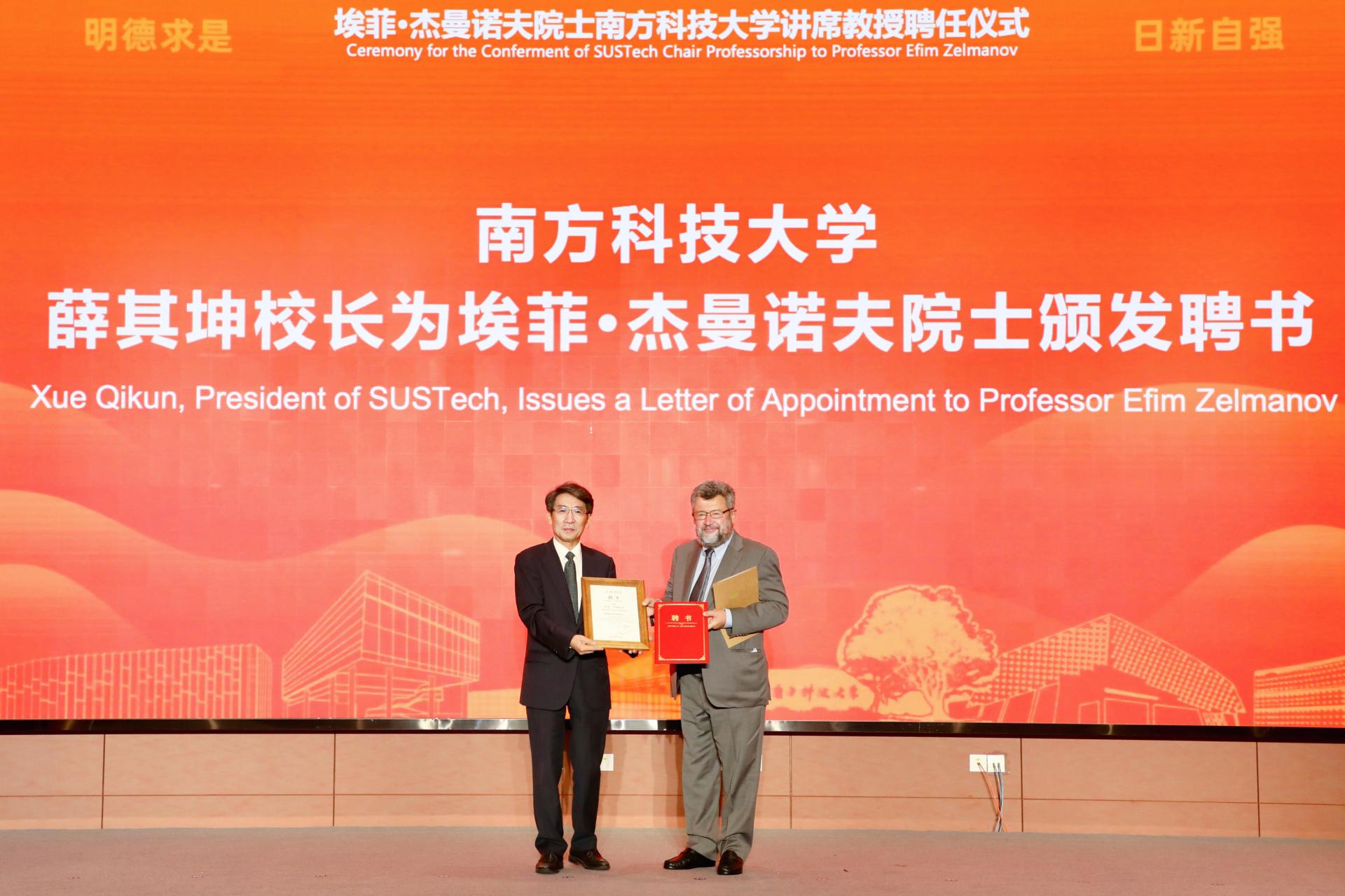 埃菲·杰曼諾夫(右)從南方科技大學(xué)校長薛其坤手中接過聘任證書。南方科技大學(xué)供圖