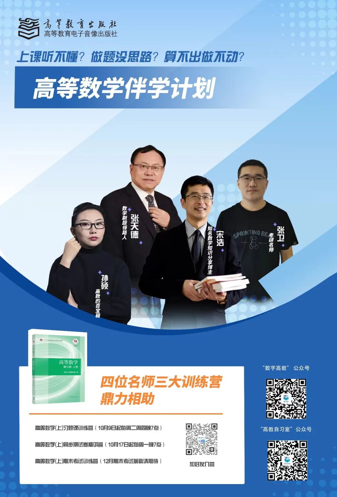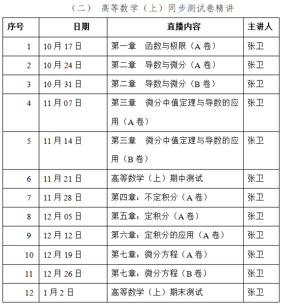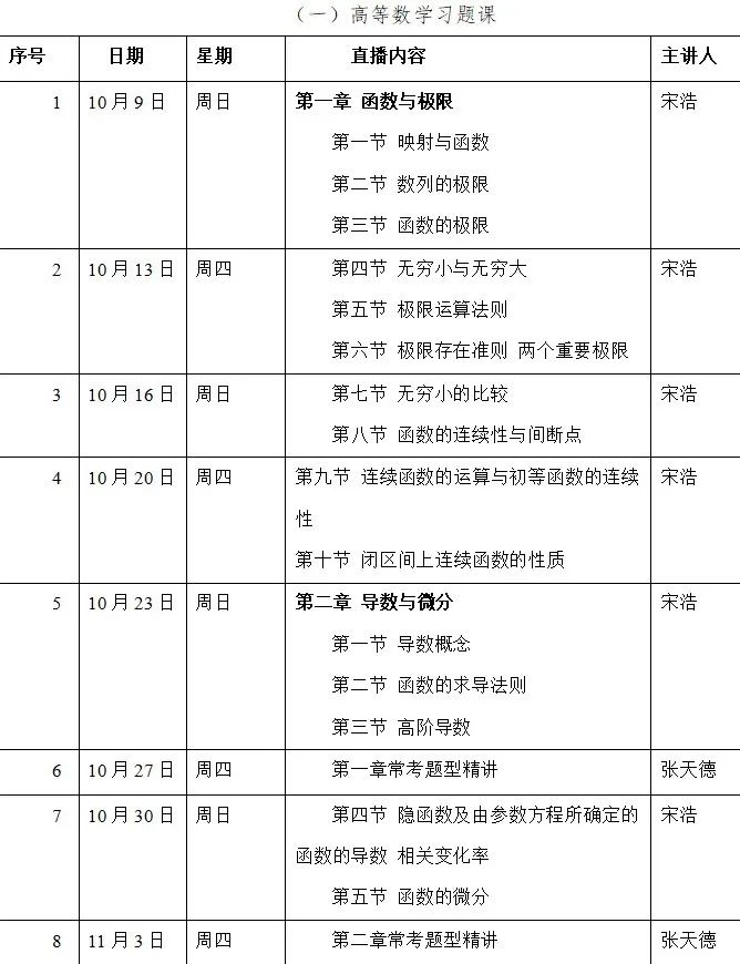 “高等數(shù)學伴學計劃”共設(shè)立“高等數(shù)學(上)習題課”“高等數(shù)學(上)同步測試卷精講”“高等數(shù)學(上)期末考試專項輔導”三項活動,38場直播。深受同學們喜愛的四大名師擔任此次活動的主講人:山東省教學名師、“行走的題庫”山東大學張?zhí)斓吕蠋?/span>;全網(wǎng)粉絲390萬、高等數(shù)學視頻播放量1.6億次的山東財經(jīng)大學宋浩老師;天津工業(yè)大學孫碩老師;考研名師、曾幫助數(shù)十萬學生考研上岸的張衛(wèi)老師。