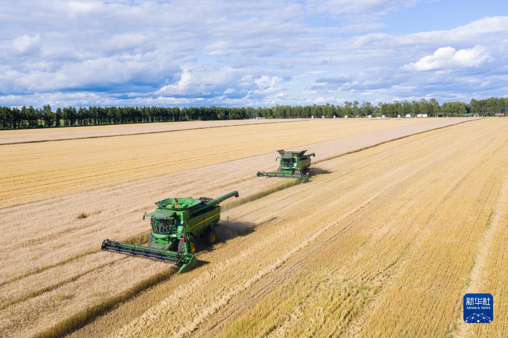 黑龍江北大荒,一臺(tái)臺(tái)收割機(jī)車往來(lái)穿梭,豐收的畫卷在這片黑土地鋪展開來(lái)。