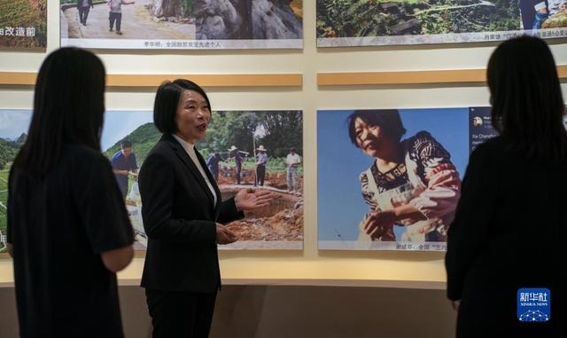 二十大代表謝成芬在云南省西疇縣“西疇精神”展覽館里講述治理石漠的故事(2022年3月26日攝)。新華社記者 江文耀 攝