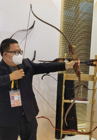 馬鑫在第五屆中國(guó)國(guó)際進(jìn)口博覽會(huì)陜西展區(qū)展示非遺產(chǎn)品秦巴弓箭