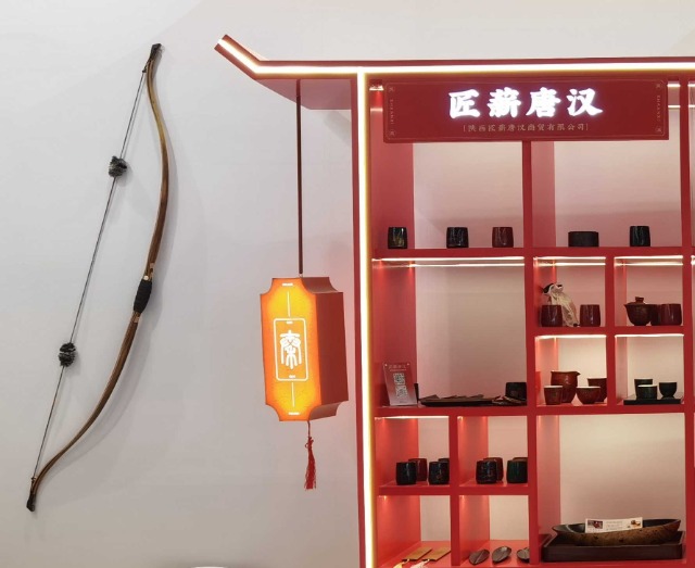 第五屆中國(guó)國(guó)際進(jìn)口博覽會(huì)陜西展區(qū)展示的部分弓箭、漆器等非遺產(chǎn)品
