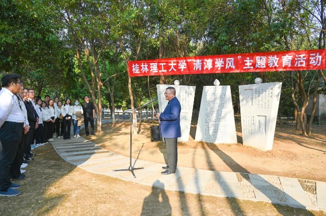 中國教育報(bào)-中國教育新聞網(wǎng)訊(記者 余闖 周仕敏 通訊員 馮廣輝 李南)近日,桂林理工大學(xué)黨委書記鄧軍在校園廉政實(shí)景中為黨員師生上了一堂生動(dòng)的“學(xué)習(xí)貫徹黨的二十大”主題微黨課?!按髮W(xué)生要原汁原味學(xué)習(xí)、原原本本領(lǐng)會(huì)黨的二十大精神,更加自覺地按照黨指引的方向健康成長,踐行‘請黨放心、強(qiáng)國有我’的錚錚誓言,擔(dān)當(dāng)起中華民族偉大復(fù)興的大任?!编囓娬f。