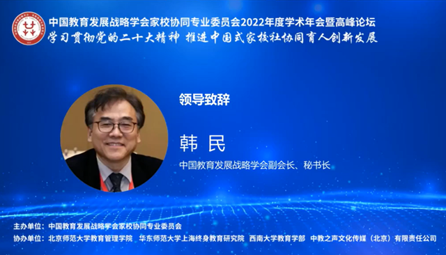 開(kāi)幕式上,中國(guó)教育發(fā)展戰(zhàn)略學(xué)會(huì)副會(huì)長(zhǎng)、秘書(shū)長(zhǎng)韓民在致辭中表示,黨的二十大報(bào)告明確提出了“健全學(xué)校家庭社會(huì)育人機(jī)制”的戰(zhàn)略任務(wù),為我們創(chuàng)新家校社協(xié)同育人提供了根本遵循。中國(guó)教育發(fā)展戰(zhàn)略學(xué)會(huì)家校協(xié)同專業(yè)委員會(huì)理事長(zhǎng)程錦慧表示,本次年會(huì)旨在促進(jìn)會(huì)員相互學(xué)習(xí)、共同提高,為形成“資源共享,協(xié)同發(fā)展”的學(xué)術(shù)研究氛圍搭建平臺(tái)。