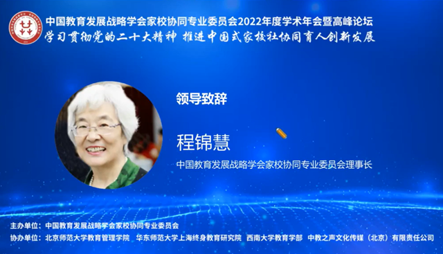 據(jù)悉,本次學(xué)術(shù)年會(huì)暨高峰論壇由中國(guó)教育發(fā)展戰(zhàn)略學(xué)會(huì)家校協(xié)同專業(yè)委員會(huì)主辦,北京師范大學(xué)教育管理學(xué)院、華東師范大學(xué)上海終身教育研究院、西南大學(xué)教育學(xué)部和中教之聲文化傳媒(北京)有限責(zé)任公司協(xié)辦。