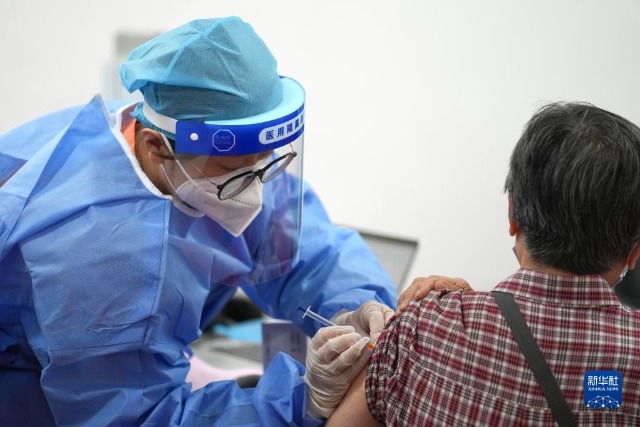 在北京市朝陽區(qū)奧運(yùn)村街道一處新冠疫苗接種點(diǎn),醫(yī)護(hù)人員為一市民接種新冠疫苗加強(qiáng)針(2022年7月13日攝)。新華社記者 鞠煥宗 攝