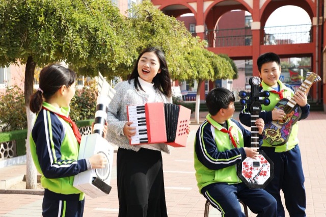 2022年10月31日,河北省唐山市豐潤區(qū)團結(jié)路小學教師和學生一起展示用廢舊物品制成的“樂器”。 朱大勇 攝
