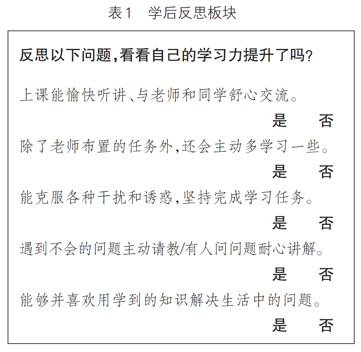 學校在學生課堂學習任務(wù)單的最后設(shè)計了學后反思板塊(見表1),引導學生每節(jié)課都對自己的學習行為進行反思、叩問,這些問題言簡意賅,條目不多但直指學習力核心,不斷引導學生走向積極學習、主動學習、愉快學習。