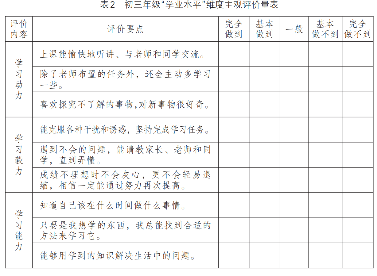 主觀評價主要考查學生的興趣、態(tài)度、習慣、方法、意志力與持久性等品質(zhì),且根據(jù)不同年級學生的特點有所側(cè)重。評價標準與學生正向評價量表中相關(guān)維度的指標完全一致,每條評價標準設(shè)置“完全做到”“基本做到”“一般”“基本做不到”“完全做不到”五個層次,分別對應(yīng)5分—1分。例如初三年級“學業(yè)水平”維度主觀評價量表(見表2)。