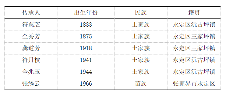 永定土家刺繡是一種普遍流傳于婦女之間的傳統(tǒng)手工技藝,歷史久遠,其源頭可以追溯到土家族服飾的起源。《后漢書·南蠻西南夷列傳》記載“織績木皮,染以草實,好五色衣服,制裁皆有尾形”;唐代詩人劉禹錫詩云“蠻衣斑斕布”;《宋史·蠻夷傳》記載“椎髻跣足,走險如履平地,言語侏離,衣服斑斕”,從這些記載土家族服飾的史料中可以窺見土家刺繡久遠的起源。2001年出土的土家族“八幅羅裙”將永定土家刺繡有據(jù)可考的歷史推進至明代中晚期。歷史上,永定土家刺繡為婦女之間互相傳播和母女之間代代相傳,據(jù)永定土家刺繡傳承譜系記載,清中期至今有6名傳承人(見表1)。