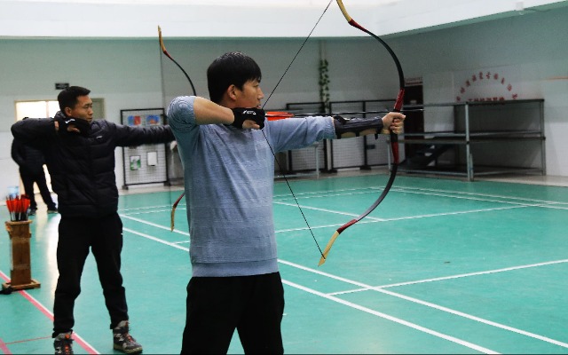 教練對(duì)學(xué)員開弓姿勢(shì)進(jìn)行指導(dǎo)和交流