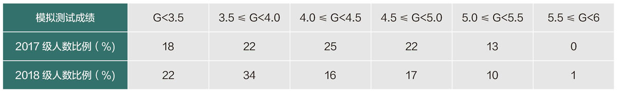 表2:2017、2018級(jí)中加合作辦學(xué)項(xiàng)目學(xué)生入學(xué)考試成績(jī)分布