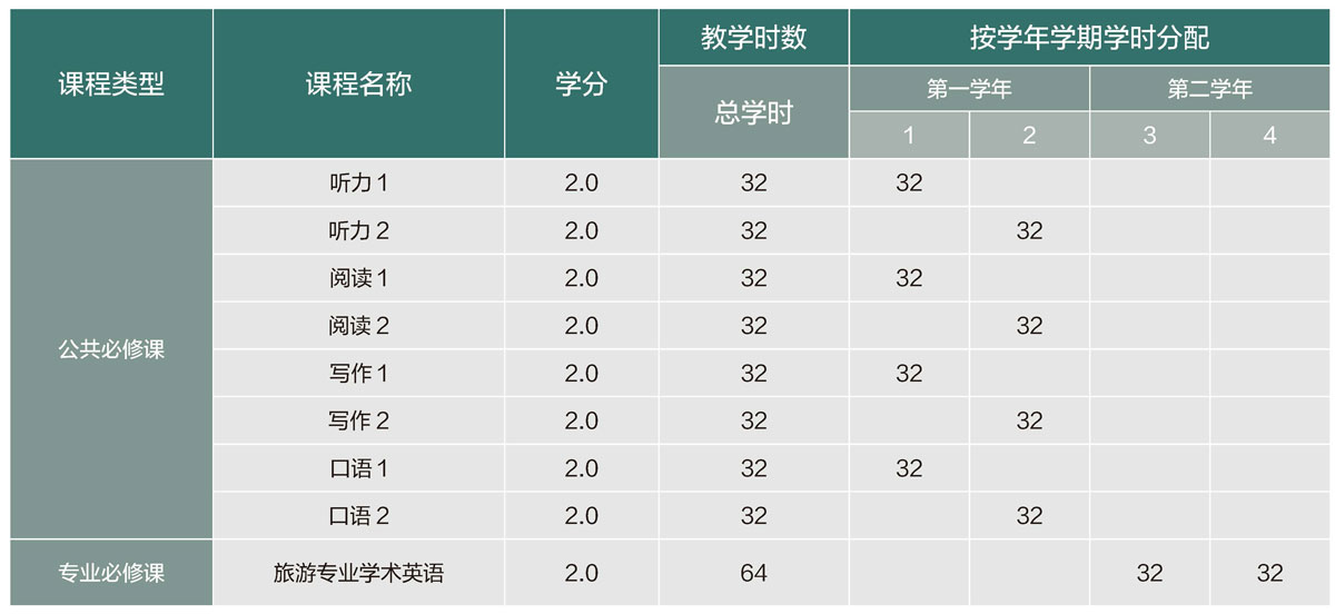 學(xué)院根據(jù)培養(yǎng)方案要求,為本項(xiàng)目學(xué)生一年級(jí)開(kāi)設(shè)英語(yǔ)課程,每學(xué)期128課時(shí),共計(jì)256學(xué)時(shí);二年級(jí)每學(xué)期開(kāi)設(shè)旅游專(zhuān)業(yè)學(xué)術(shù)英語(yǔ)課程32課時(shí),共64學(xué)時(shí)(見(jiàn)表1)。根據(jù)中加合作辦學(xué)項(xiàng)目的培養(yǎng)方案要求,只有專(zhuān)業(yè)和英語(yǔ)水平均達(dá)到圣文森山大學(xué)要求的學(xué)生方可申請(qǐng)第四年赴圣文森山大學(xué)學(xué)習(xí)。圣文森山大學(xué)對(duì)學(xué)生的英語(yǔ)水平考核以雅思成績(jī)?yōu)闇?zhǔn),要求總分達(dá)到6.5分水平,且單科不低于6.0(其他國(guó)際認(rèn)可的同等英語(yǔ)考試成績(jī)也可以接受)。