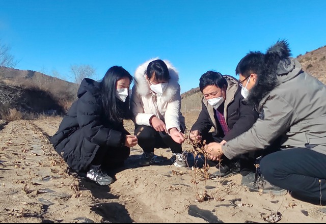 圍場縣銀里村黨支部書記孫國志(右二)和燕山大學(xué)駐村工作隊的同志,一起來到藥材種植戶高亞紅(左一)家的地頭,查看蒼術(shù)越冬情況,探討冬季蒼術(shù)種植養(yǎng)護(hù)小妙招。
