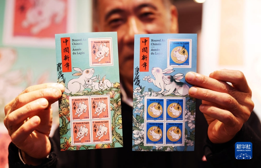 2023年1月14日,在法國(guó)巴黎舉行的兔年生肖郵票發(fā)行儀式上,郵票設(shè)計(jì)者陳江洪展示兔年生肖紀(jì)念郵票。新華社記者 高靜 攝