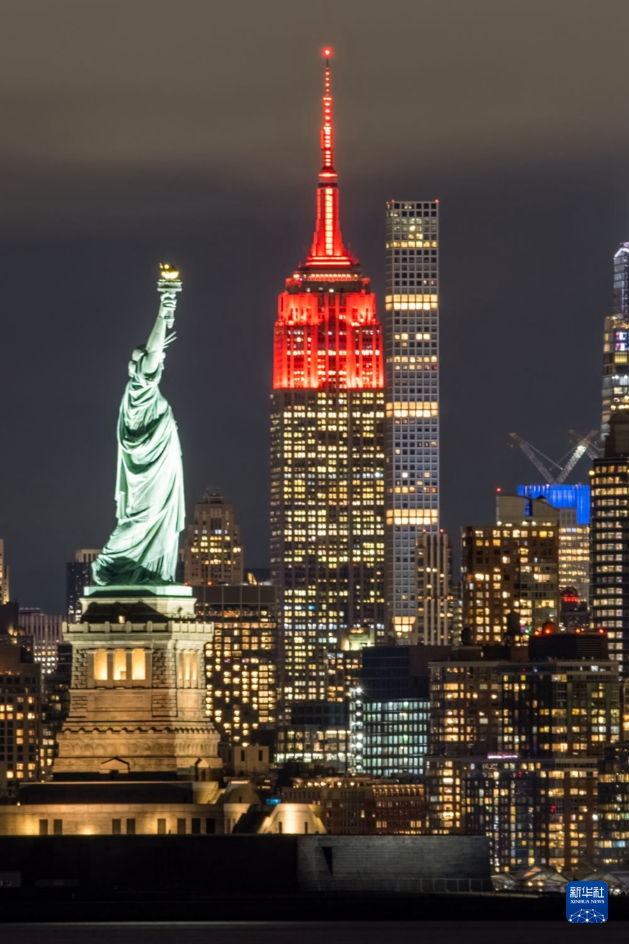 2023年1月20日,美國(guó)紐約帝國(guó)大廈亮起中國(guó)春節(jié)主題燈光。新華社發(fā)(周煥新攝)